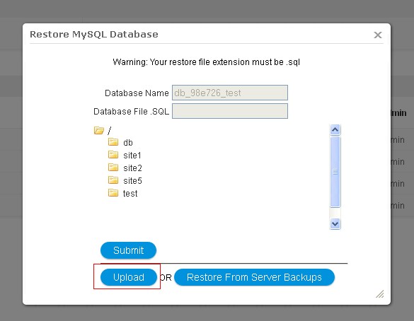 - After a database is created, on the left handside of your database, you should see a Restore Icon. Click on Restore and choose to restore your database by uploading a backup file.