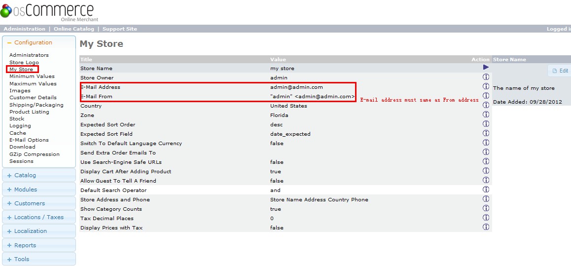 2 Go to Configuration > My Store to see if the Email Address and Email From fields are the same as the outgoing email address you'll be using for the setup.