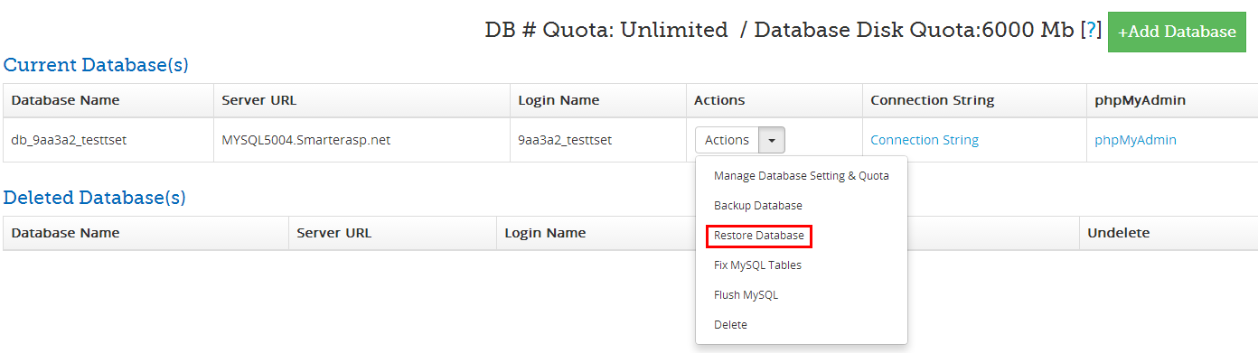 7. After a database is created, on the left handside of your database, you should see an 'Action' drop down list. Select 'Restore Database' and select 'Upload your backup file' to restore your database by uploading a backup file.