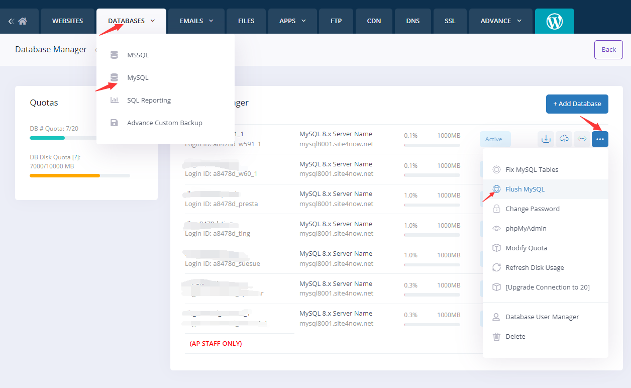 1. You can go to Control Panel ---> Databases --->MySQL ---> Flush MySQL to flush all the connections to fix this problem.