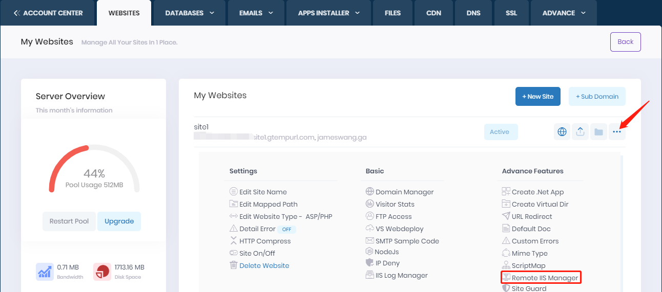 You can enable or disable Remote IIS function from your hosting control panel --> WEBSITES--> Manage Website --> Remote IIS Manager.