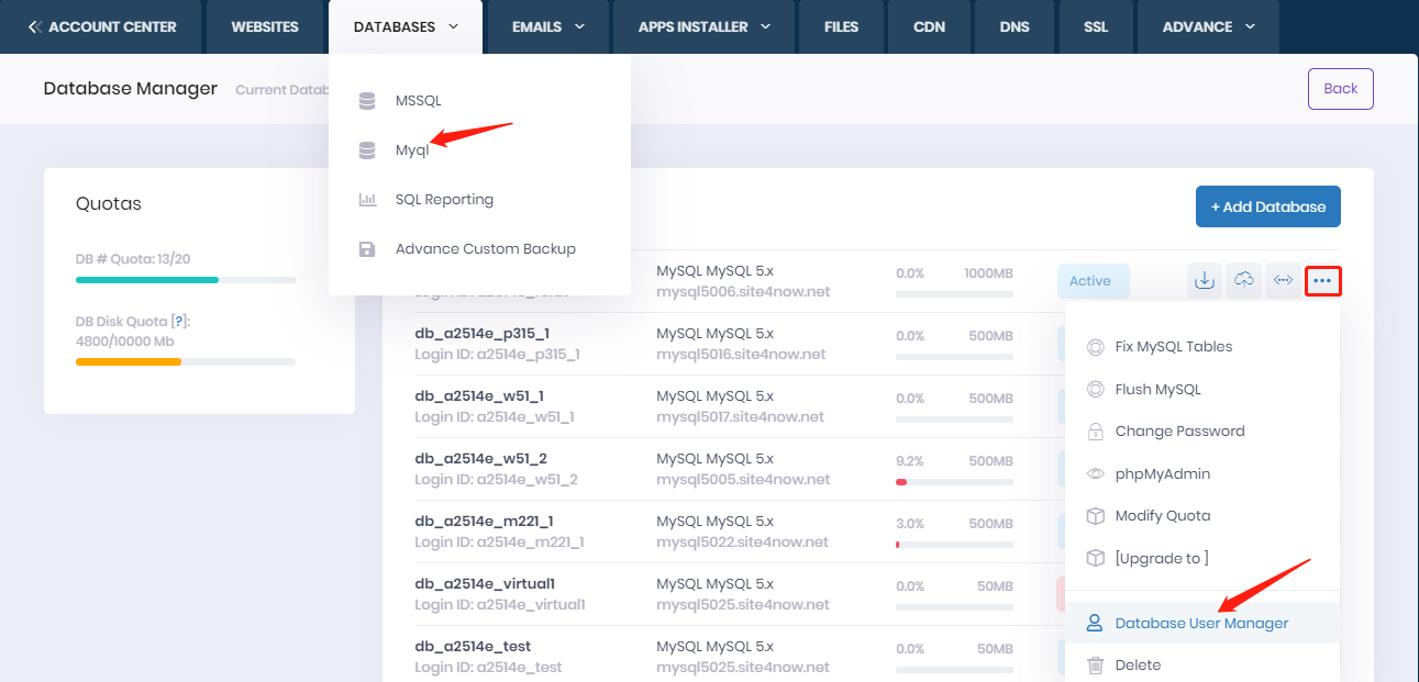 3. Choose MySql, then Click "Database User Manager" to add new mysql user
