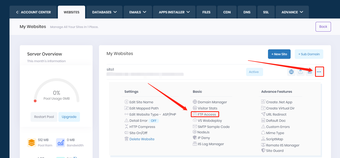 1. Login to your hosting control panel --> Click "..." beside your site --> Click "FTP Access" under Basic --> Click "Add FTP User".