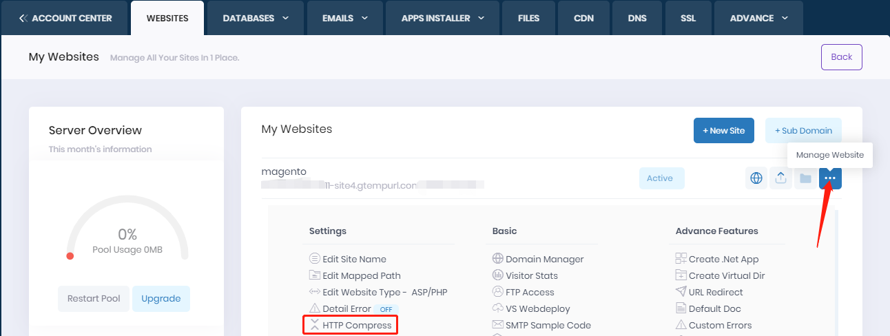 You can enable/disable HTTP Compression function from your hosting control panel --> WEBSITES --> Find the target site and click "Manage Websites" --> Then turn On or Off button beside HTTP Compress.