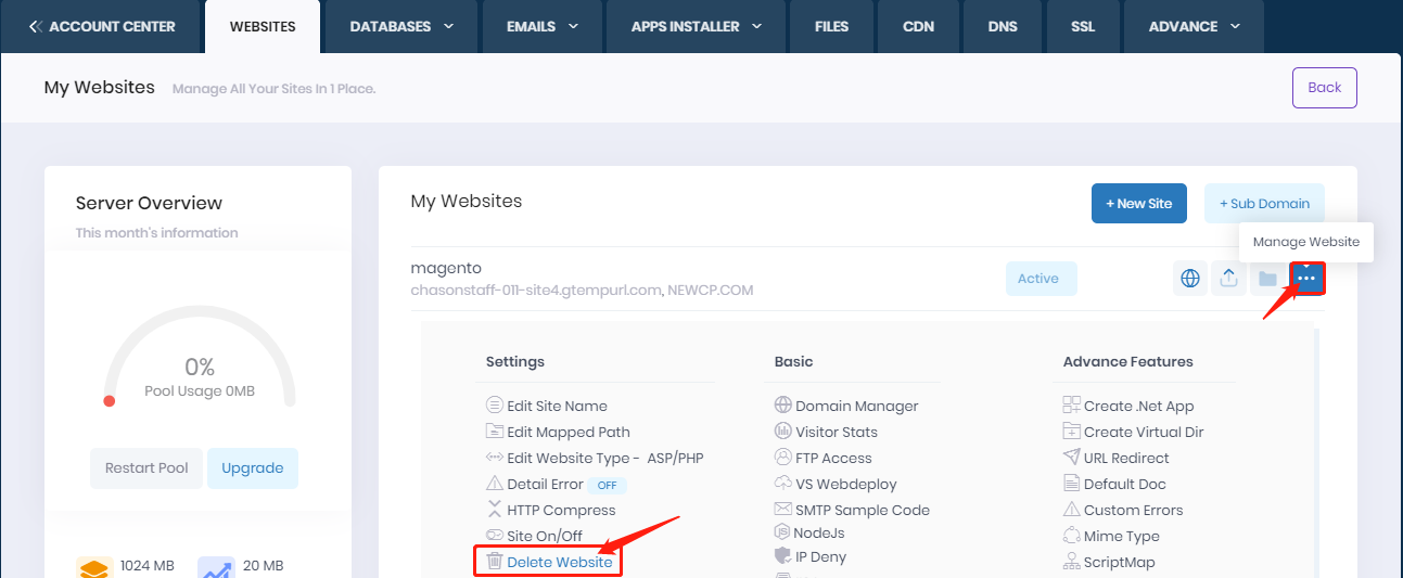 You can login to your hosting control panel --> WEBSITES --> Find the target site and click "Manage Websites" --> Then click 'Delete Website' button: