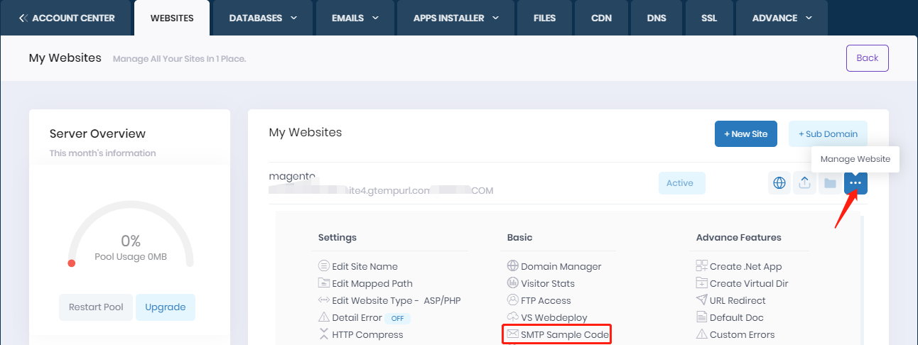 To get the Sample codes, please simply login to your hosting control panel, go to WEBSITES -->Manage Website --> SMTP Scriptes.