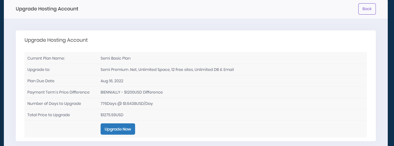 If you want to upgrade your current account to a higher plan(except upgradation from trail hosting account), you just need to pay the unused months difference between your current plan and the new higher plan. Please follow the steps below to upgrade your account