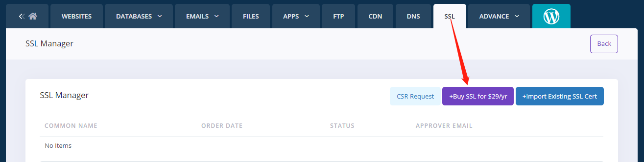 1. log in to your myASP.NET account and go to hosting control panel -> SSL, click the "+ Buy SSL for $29/yr" button