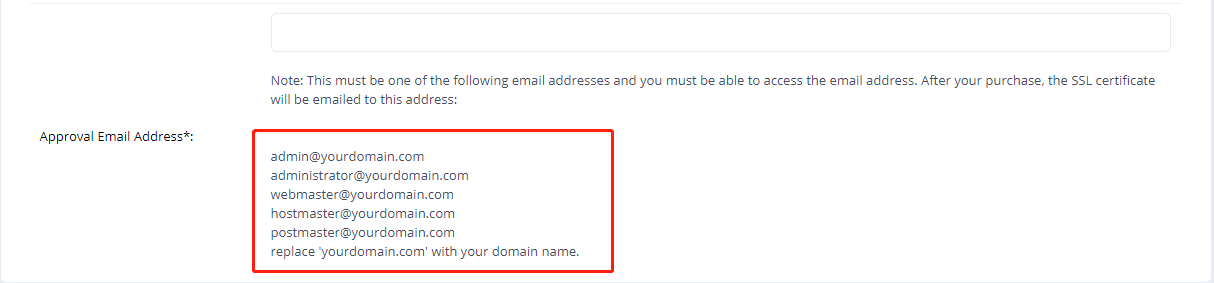 8. you will then need to choose an approval email of your choice from a generic list of @domainname.com email addresses: