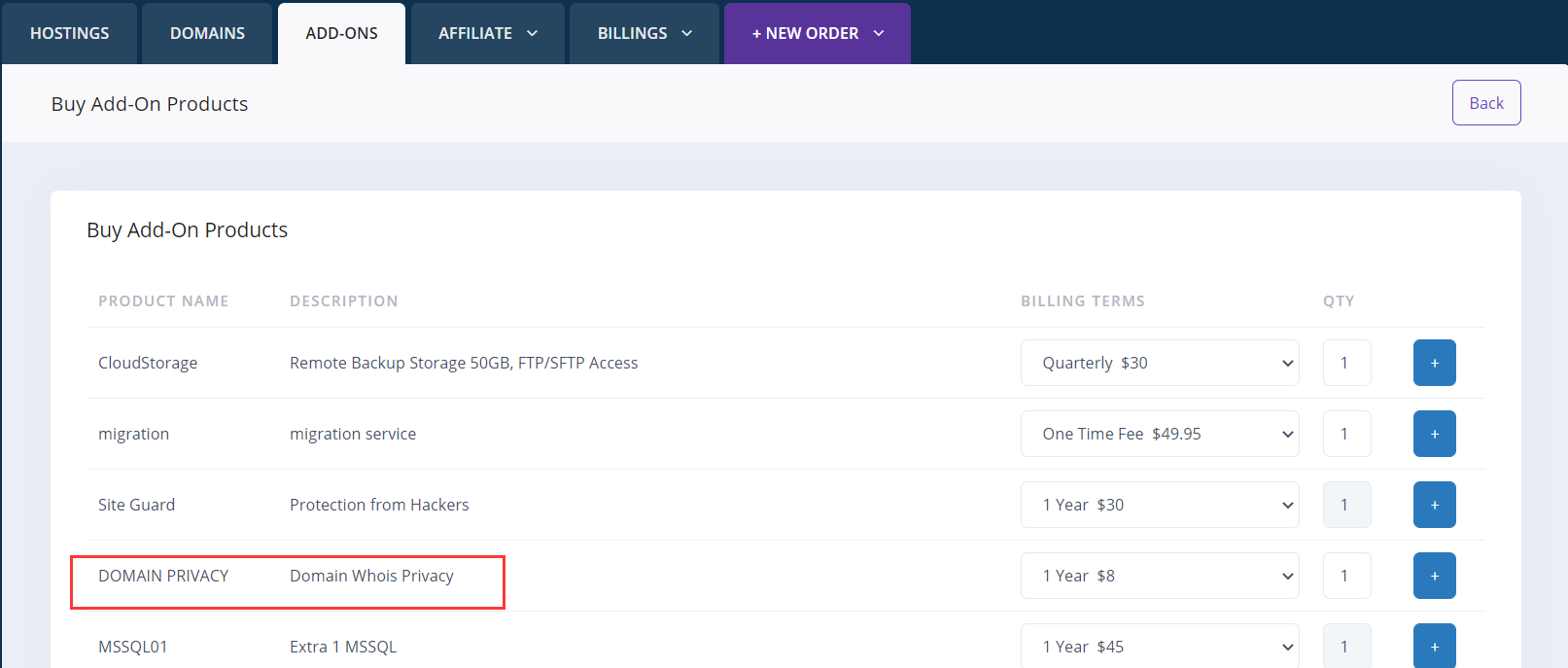 You can see this product from member account ---> Add ons --->"DOMAIN PRIVACY"