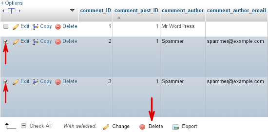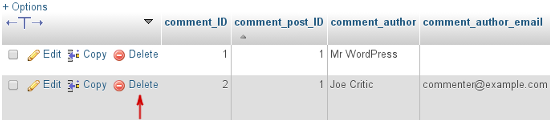 There may be times when it is easier to delete WordPress comments directly in the MySQL database by using phpMyAdmin. For example, if a post has been spammed with hundreds of comments, it is often easier to do a bulk delete operation in phyMyAdmin.