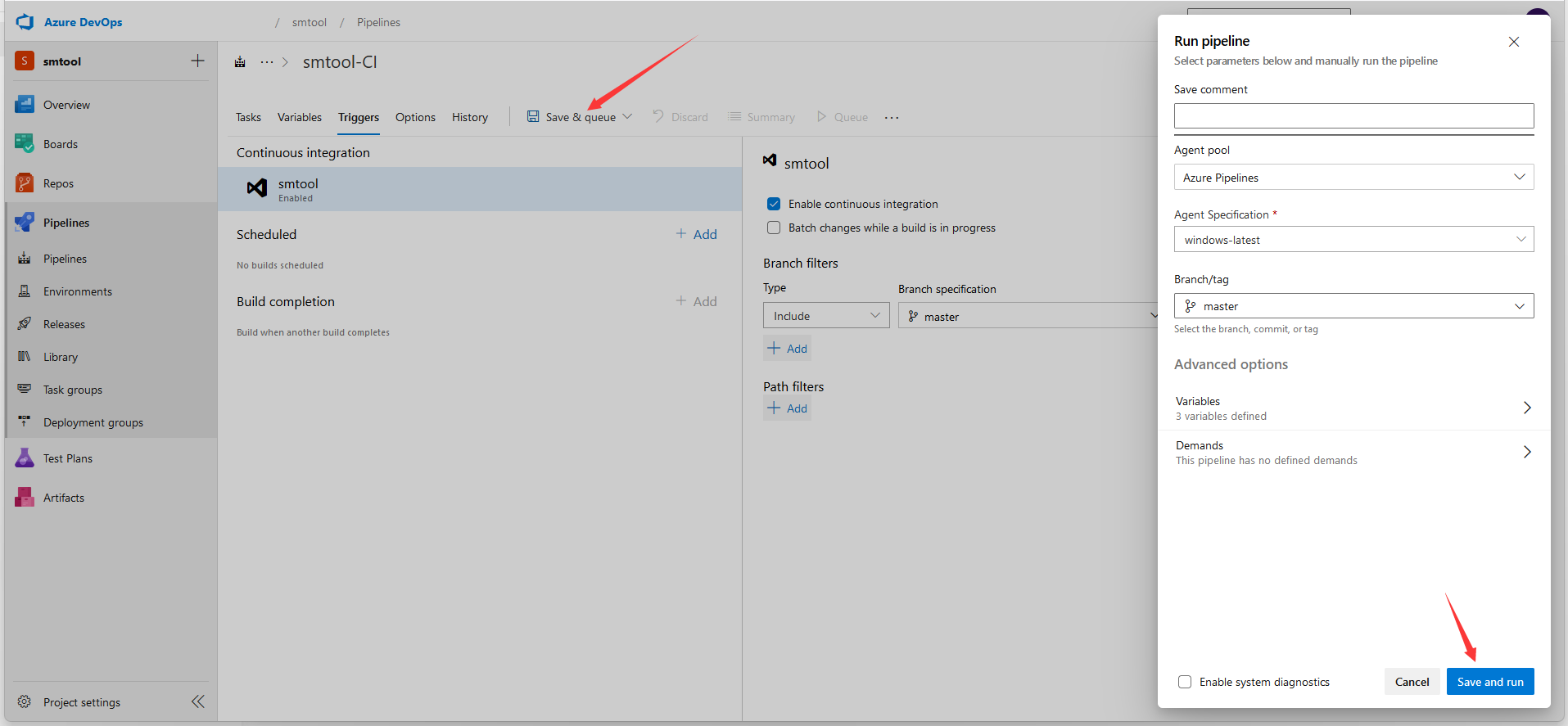 On the Triggers page, tick the Enable continuous integration. This will build your project pipeline whenever a change is committed to your repository.