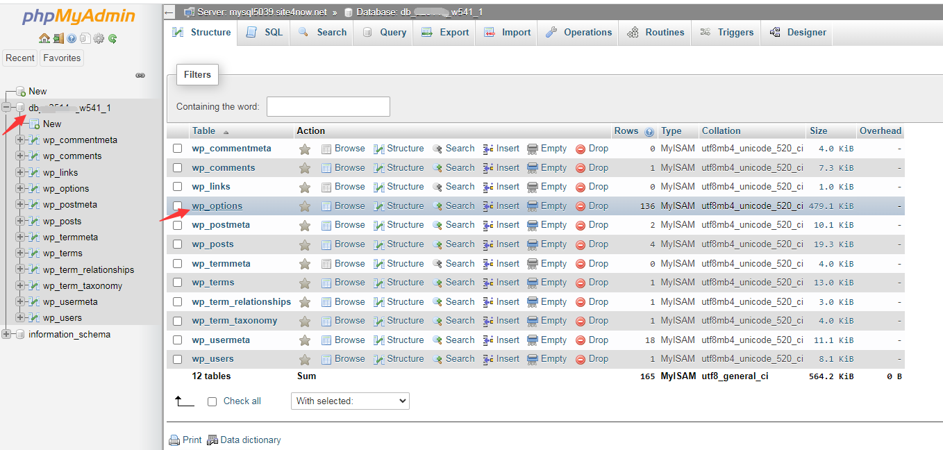 3. In the left-hand pane of phpMyAdmin, click the name of the WordPress database. A list of tables in the database appears.